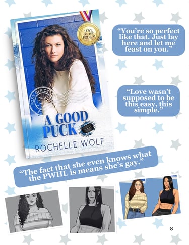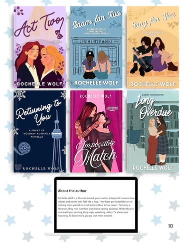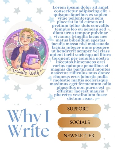 If you want your book highlighted further, upgrade by receiving an additional two-page spread that includes a showcase of your backlist, a direct message to readers, your author bio, and links to your newsletter, socials, and platforms like Ko-fi or BuyMeACoffee.